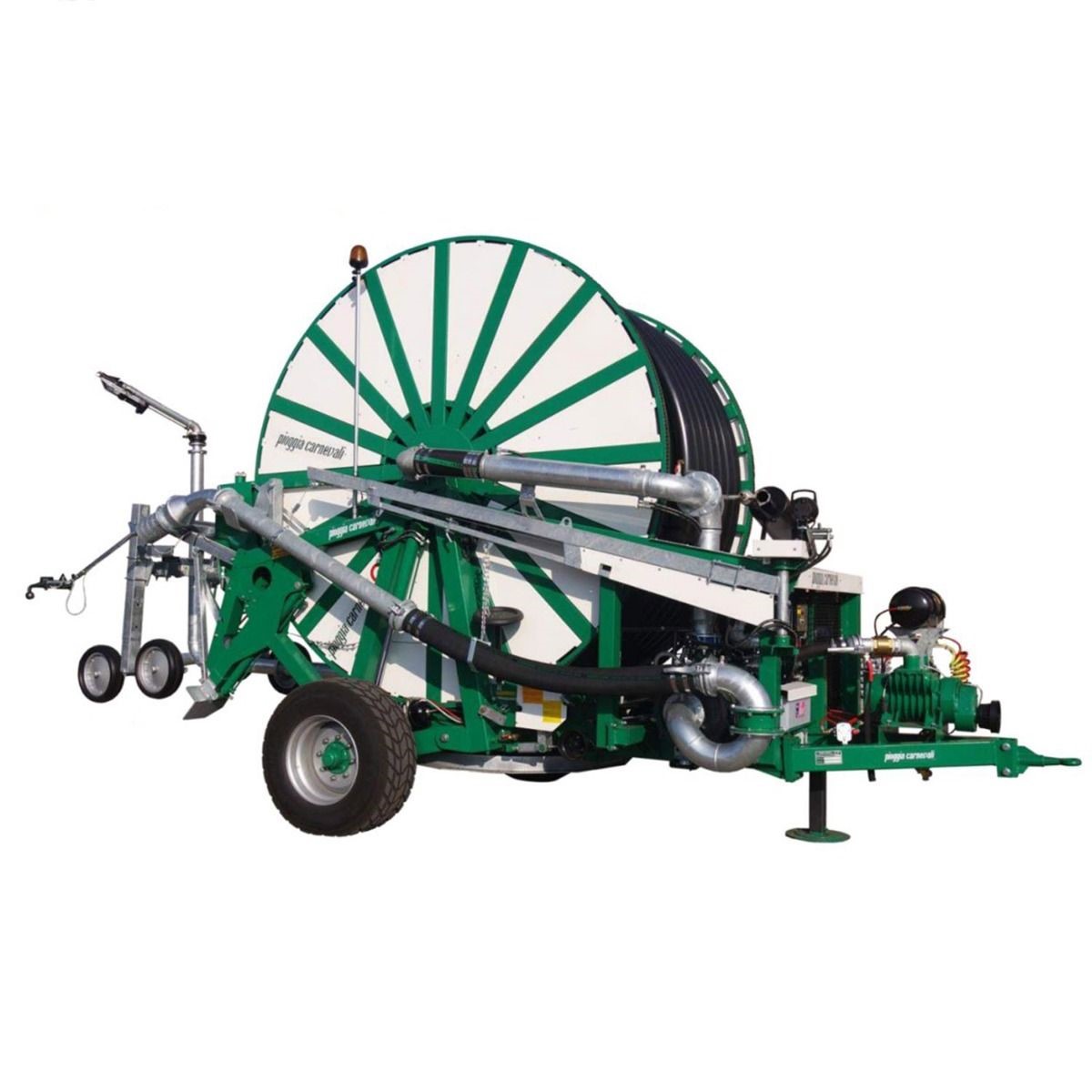 Tambur cu placa rotativa, actionare hidraulica si miscare controlata hidraulic echipat cu motopompa.Dotari satandard:Structură și tambur galvanizat și vopsit la cald, cu două roți din cauciuc ridicabile hidraulicUnitate de pompă cu motor încorporatăMotor Iveco tip N67MNTA20 6 cilindri 175 CP cu pornire electricăUnitate de control electronicConectat cu pompă cu mai multe etape CAPRARI tip MG 100 / 2ARezervor de combustibil de 330 ltEjector pentru umplerea aspirațieiRotatie hidraulicaSuporturi hidraulice în fațăPicior de sprijin hidraulicSistem de avansare cu pompă hidraulică cuplată la motorul IVECOCalculator pentru managementul irigării cu sistem de oprire a pompei cu motorCutie de viteze cu 4 trepteDispozitiv PTO pentru derulare în regim de urgențăTransmiterea mișcării la rolă prin intermediul unui lanț lateral dublu pe curea de cauciucManometruCadru mobil pentru ridicarea căruciorului cu aspersoareCompensator de vitezaCărucior cu aspersoare cu 2 roți din cauciuc solid reglabile pe înălțimeExtensie cu flanșă dublă de 50 cm pentru aspersorAspersor cu un set de duzeCompresor pentru golirea rapidă a P.E. Capac dublu lateral pentru rezervorProtecția motorului cu baldachin și plase de închidereLumină laterală pe rezervorMacara de aspirație cu troliu și rotație hidraulicăAdmisie complexă Ferrari complet D.150 mmArticulație pivotantă pentru aspirațieProtectie impotriva accidentelorManual de utilizareCertificat de conformitateSemnal luminos intermitent pentru desfacerea furtunului (numai pentru mașinile aprobate) Dotari optionale:Articulatie de dilatare elastica pentru cuplarea pompei2 balasturi de beton pentru cărucior standardCărucior din cauciuc solid cu 4 roți reglabil pe înălțime2 balansoare cu câte 2 roți în loc de roți standardAspersor secundar cu supapa de 1″ 1/22 Discuri de ghidarePereche de pieptene pentru discuri de ghidareConexiune cu flansa si 3 carlige pentru deconectarea rapida a aspersoruluiGalvanizarea structurii (mașină + pompă cu motor)Galvanizarea la cald a roleiBara de lumină cu atașamenteOmologare rutiera